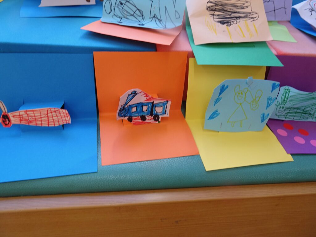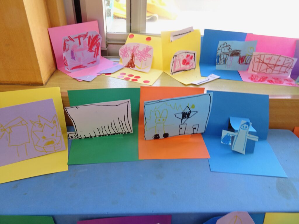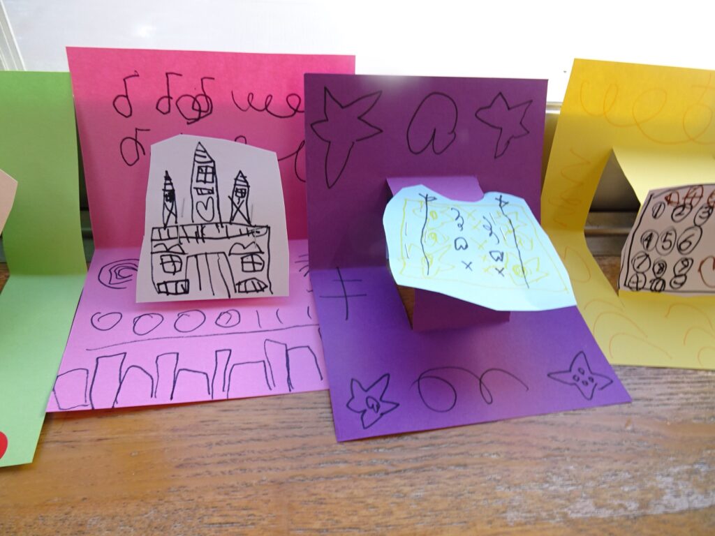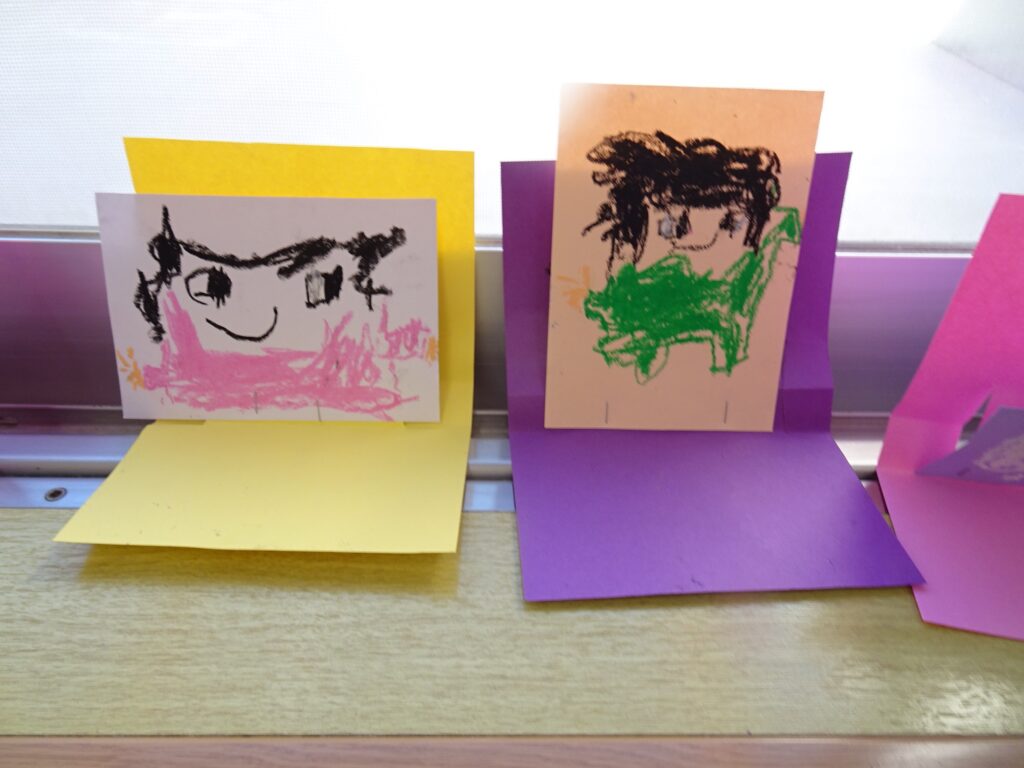いつものお絵描きを立てて飾ろうという遊びです。