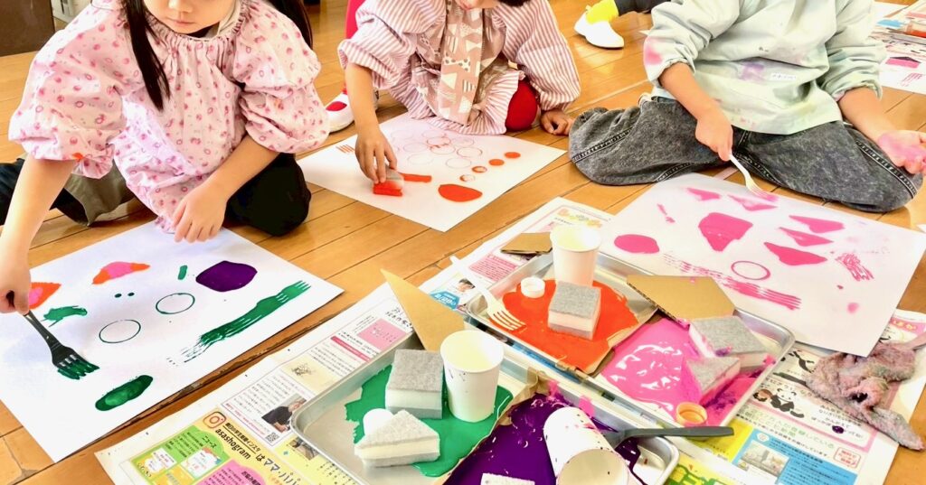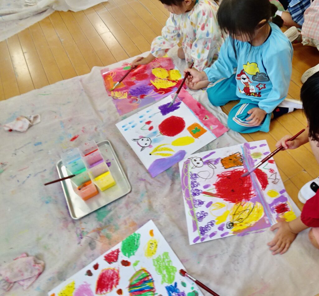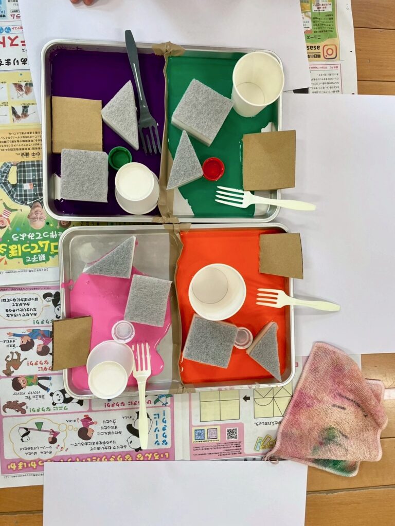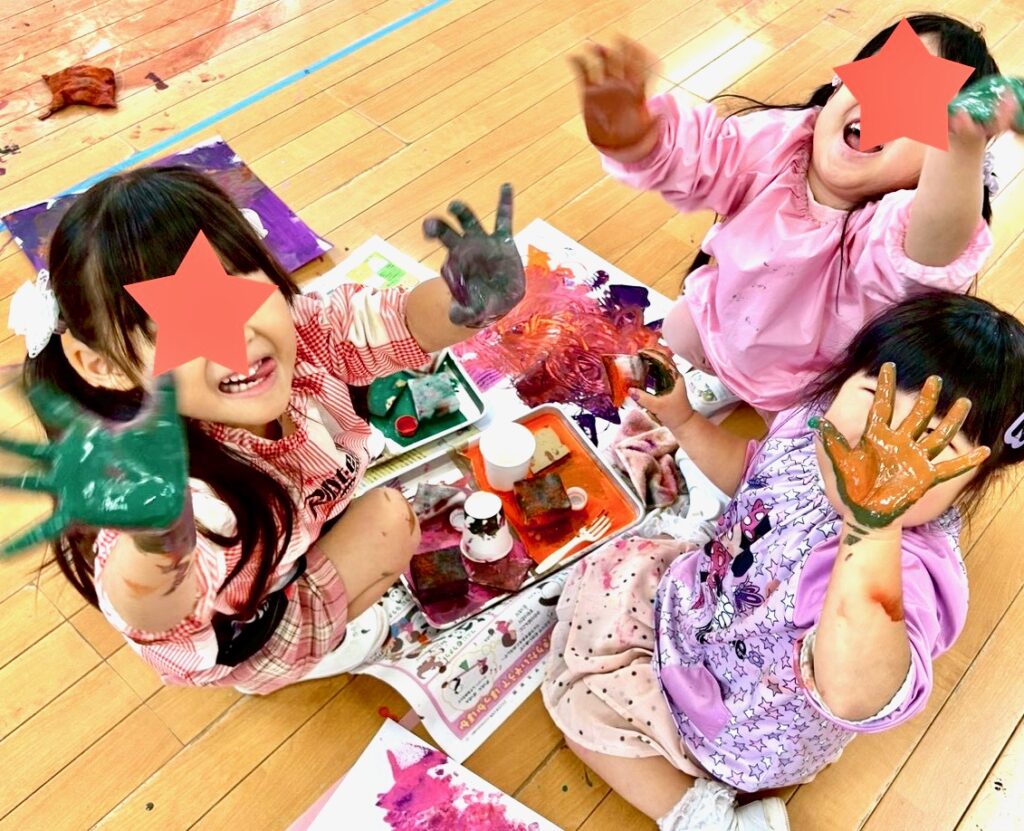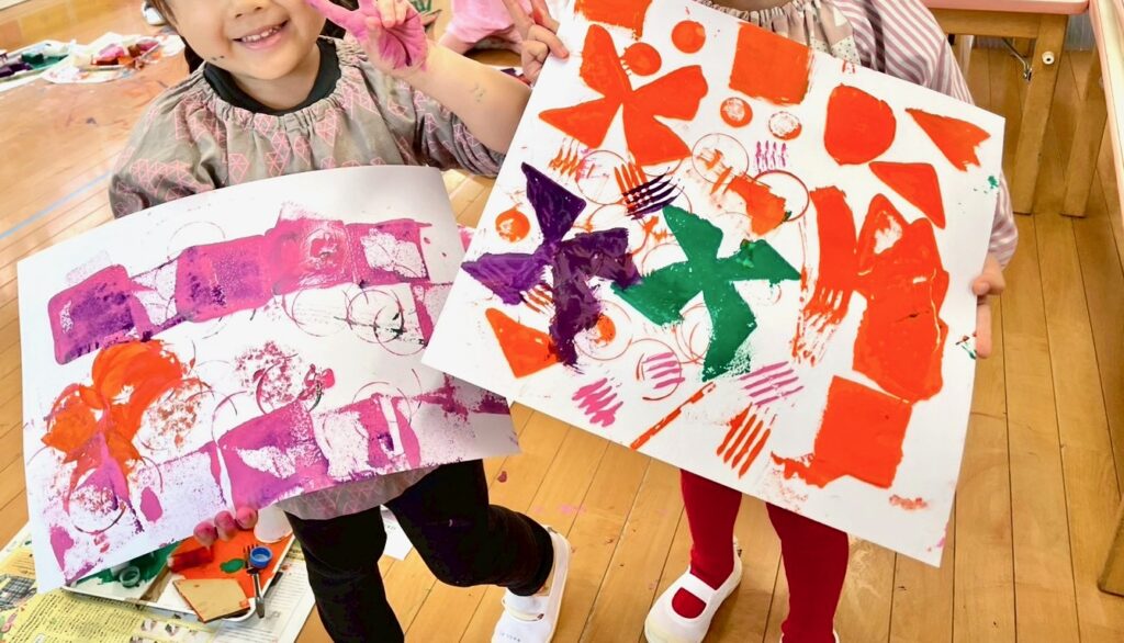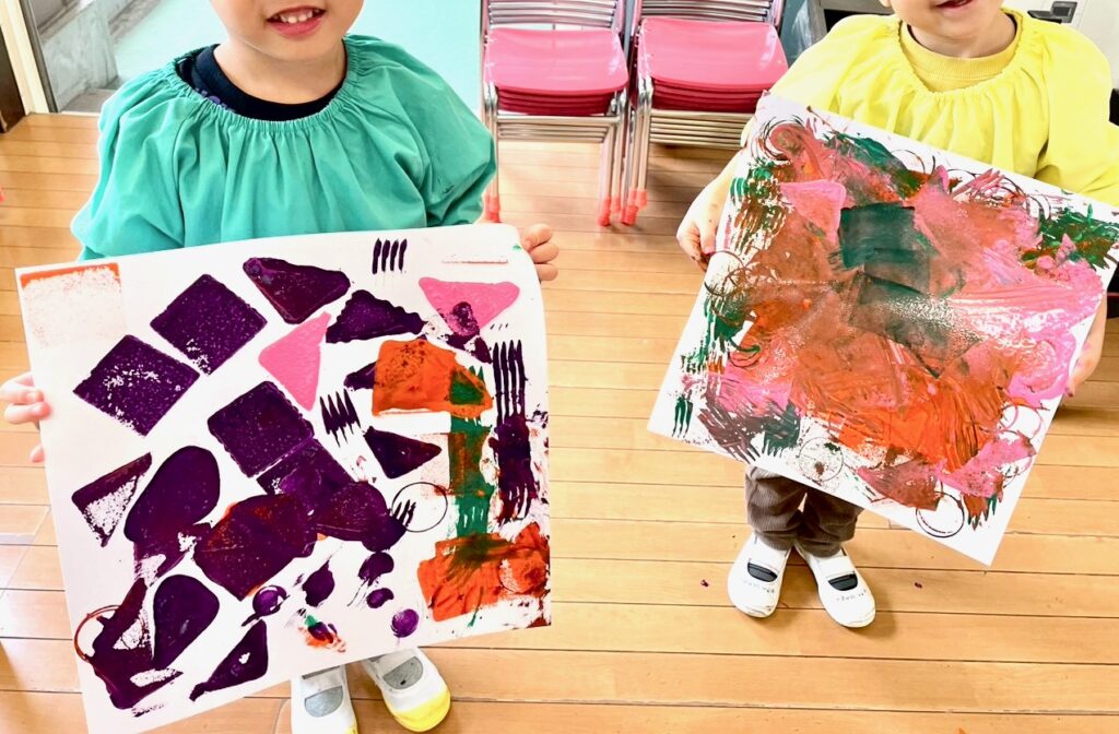 スタンプ遊びは、濃いトロトロの絵の具が面白いです。