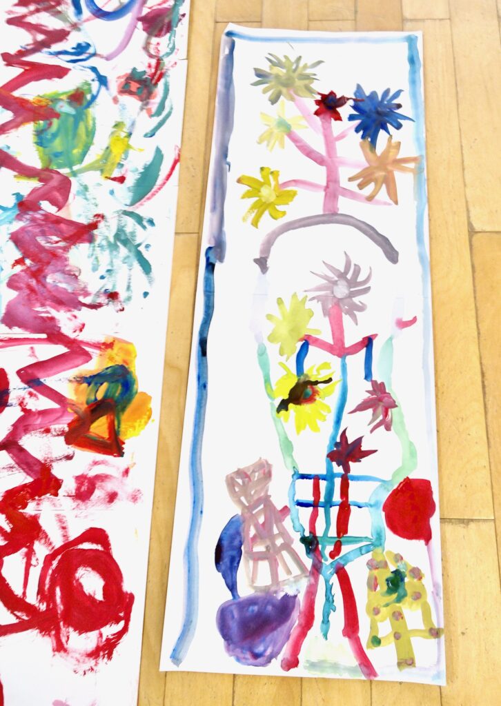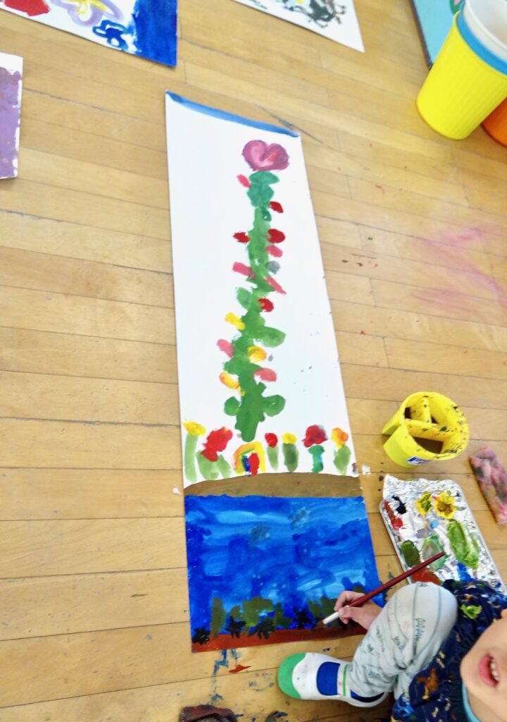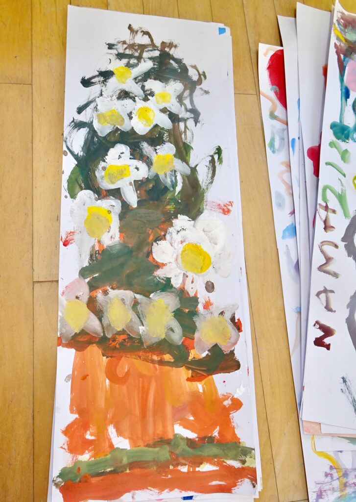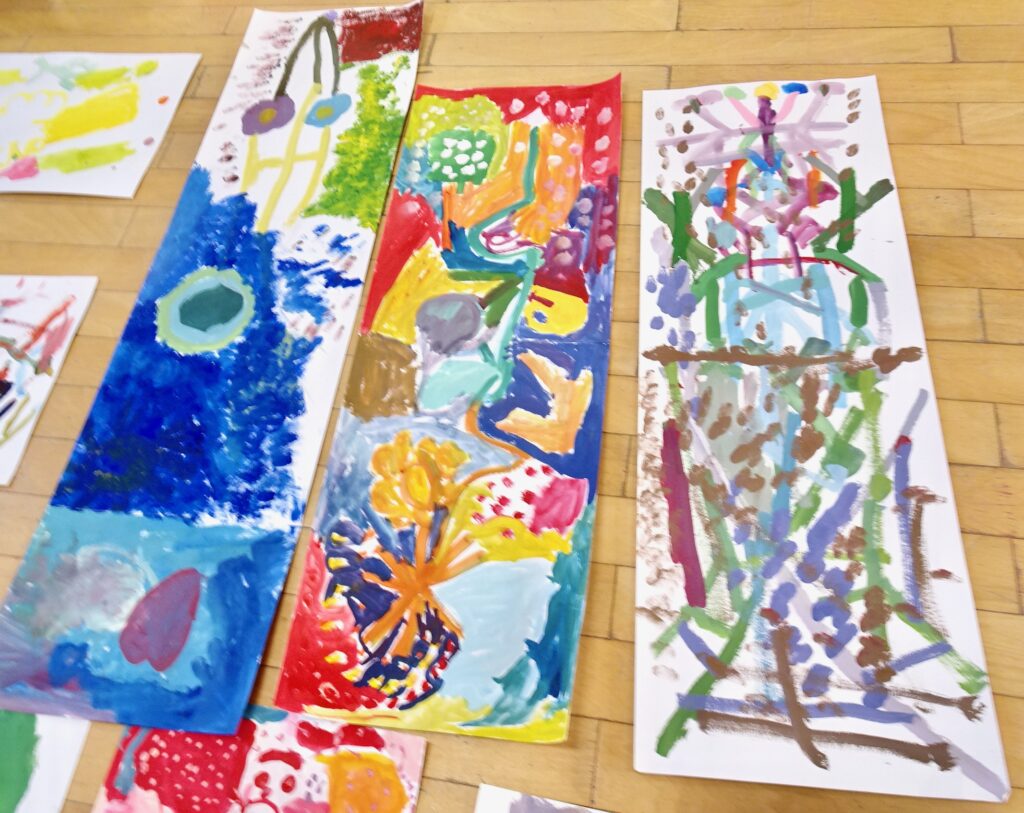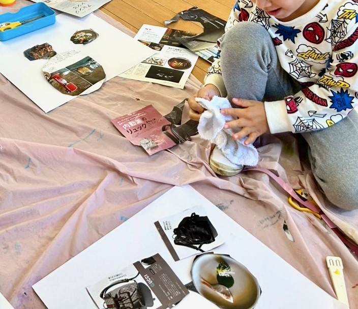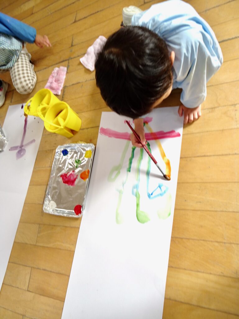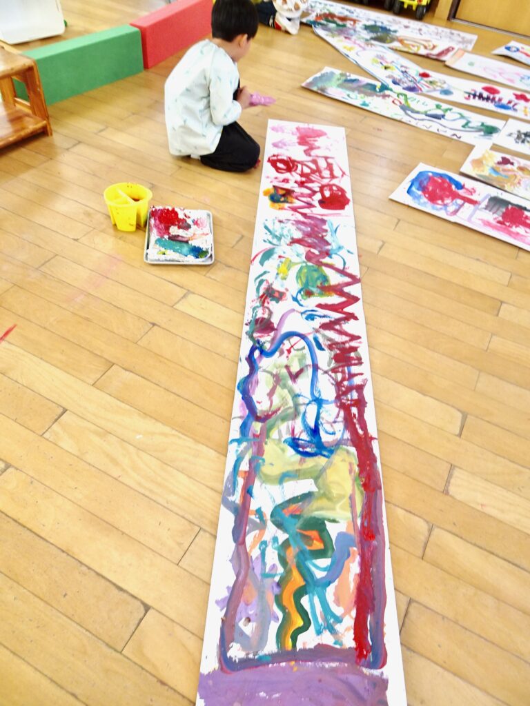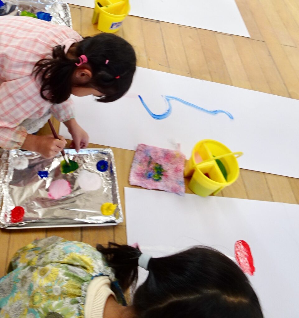 スタンプ遊びは、濃いトロトロの絵の具が面白いです。